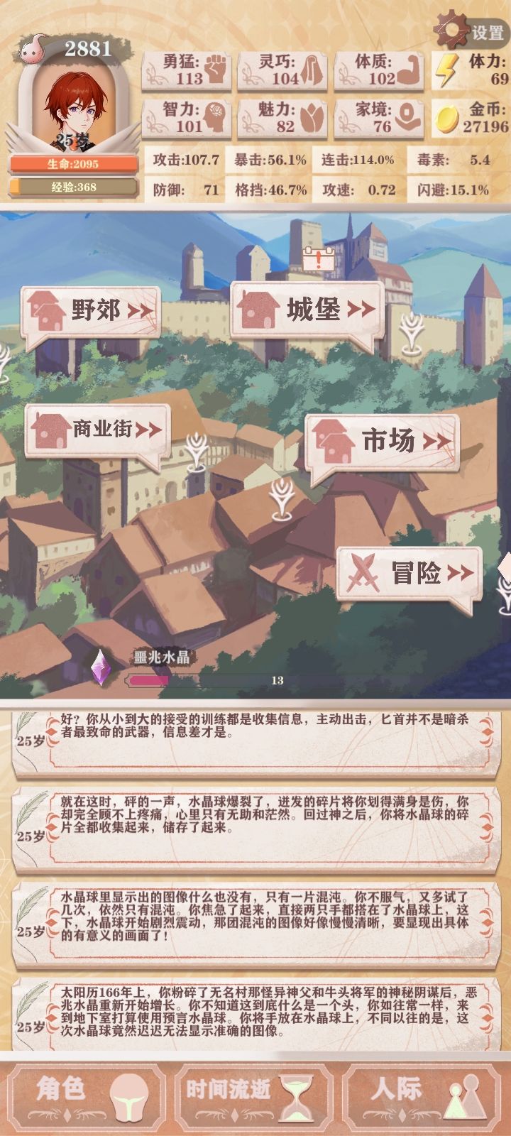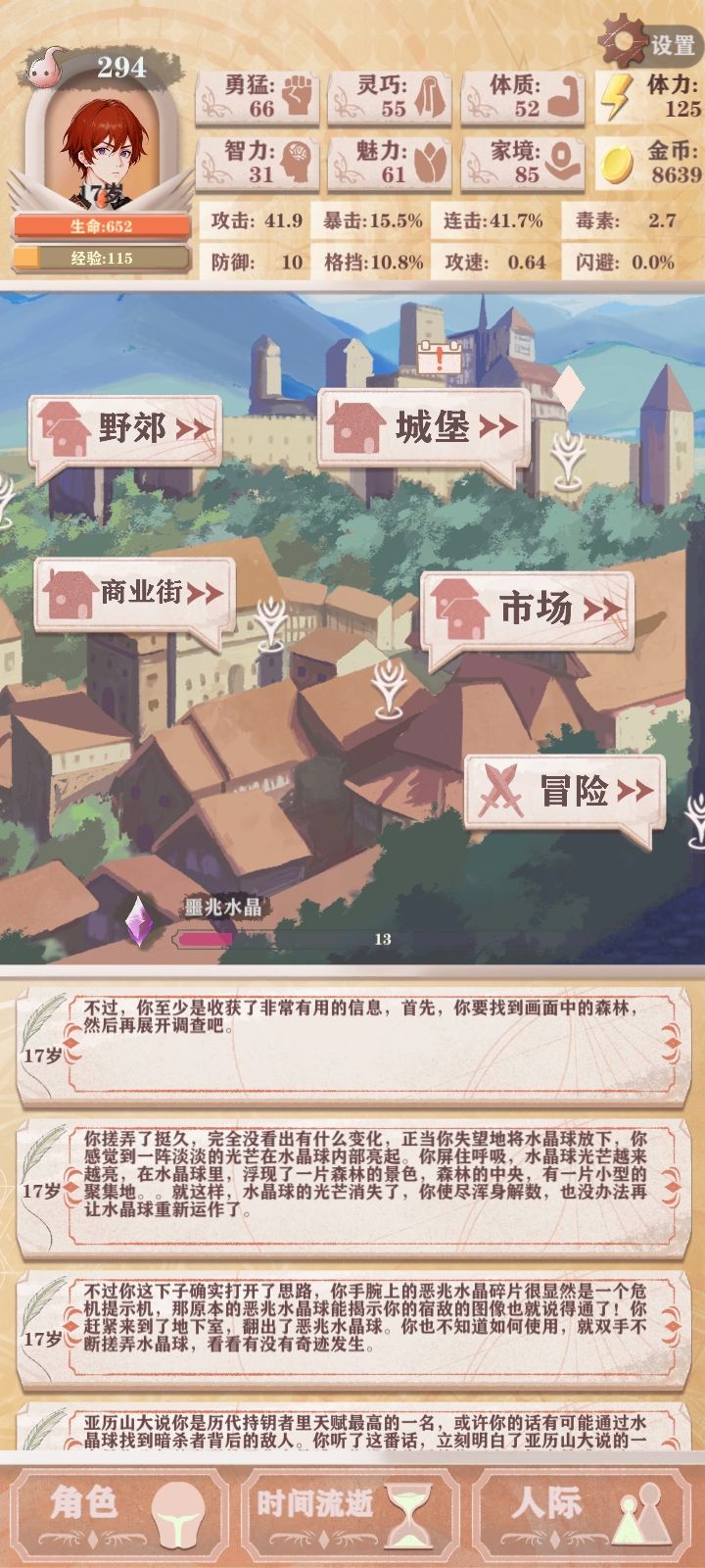 十五岁,成年能喝酒加体力别忘了,还有去王城开启公主前置,技能血舞之后点暴击和攻速,在之后连击,强袭,最后隐身闪避格挡之类保命技能随意了