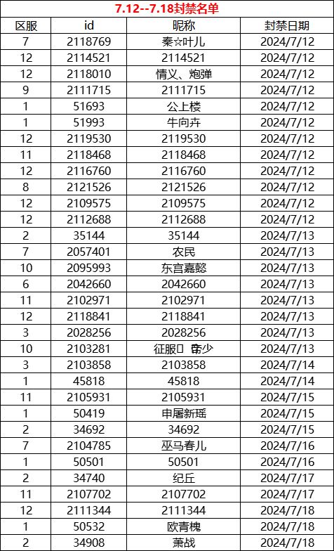 《战警:大国崛起》2024年7.12--7.18日封禁名单