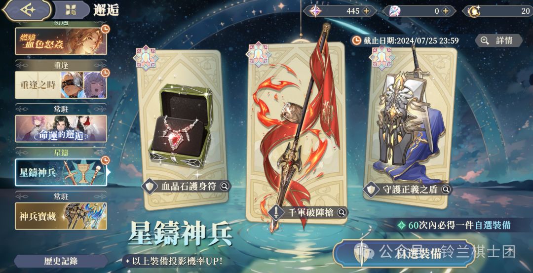 台服周五向全服玩家通过邮件直接送了一个3件新装备的随机礼包,会随机获得千军破阵枪、守护正义之盾、血晶石护身符中的任意一个