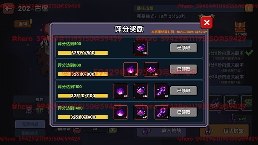 评分奖励是每个图都有的,里面有强化材料,继承材料,进图门票,10个图记得锁体力去打哦(只能领取一次),还有不同职业的排行榜赛季评分也是可以领取的