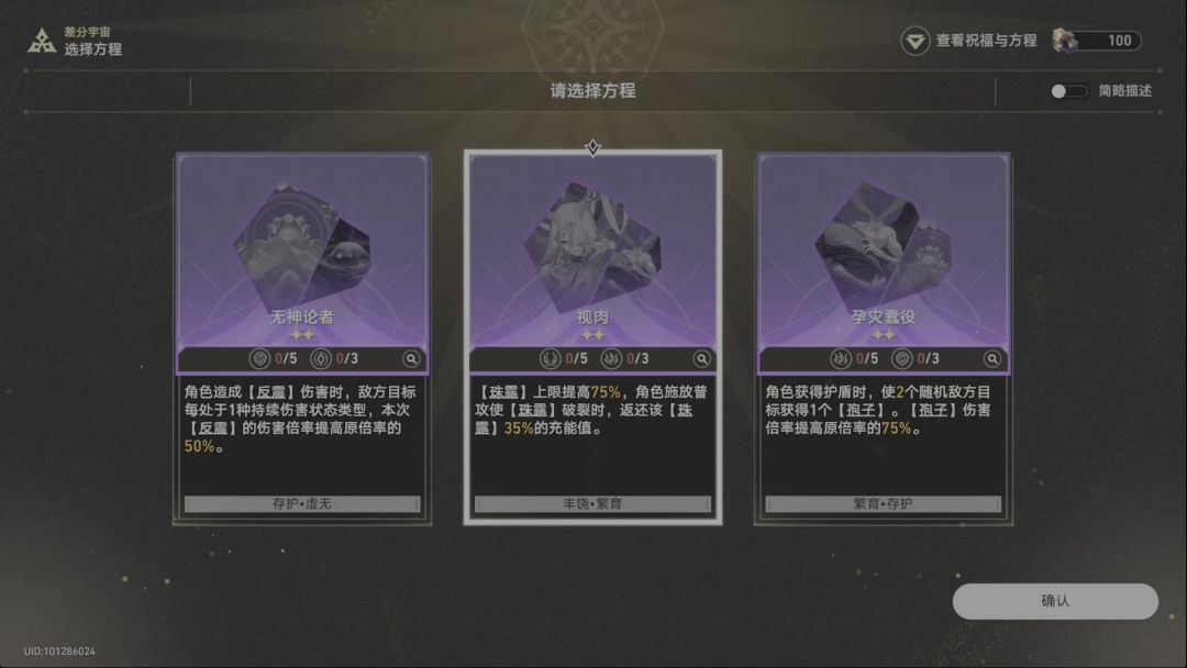 开局可选的方程不少:【反有机杀手】可以提供较高增伤,就是激活需要的祝福比较偏(需要【智识】+【毁灭】);中间两个则可以提供一些在前后期都有一定作用的增伤效果;最后一个【视肉】在前期是完全没用的,但是后期提升相对较大。祝福也相对好凑: