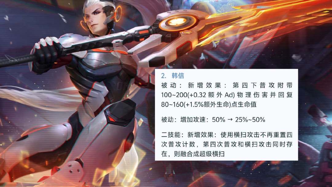 虽然被动前期增加的攻速降低,但是毫无疑问这次韩信的调整是一次巨大的增强。被动新增的效果让韩信的伤害变得更高,并且还自带回复,这个回复是额外生命值加成,意味着韩信可以出一些肉装。最重要的是二技能的横扫和被动第四下普攻挑飞可以融合,本身二技能横扫就有额外伤害,配合第四次普攻的额外伤害,一个超级横扫的伤害不会比猴子的强化普攻低。
