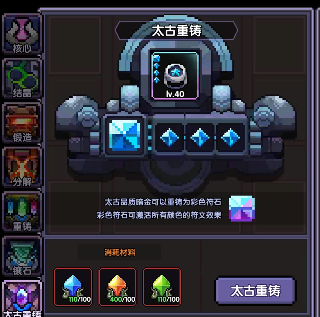 2.太古暗金可以重铸成彩色孔给三系用,非常方便