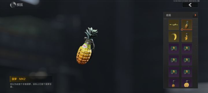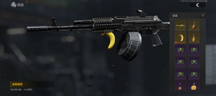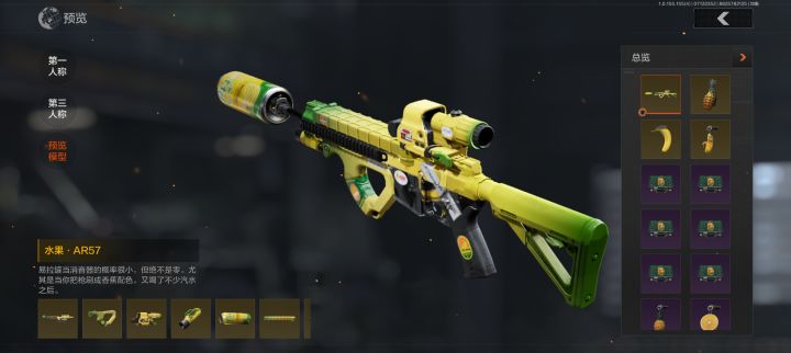 “水果风暴”枪械涂装军需中的香蕉握把与菠萝·MK2还是挺有趣的,水果味挺足的,而水果·AR57的消音居然是用易拉罐去搭配,也是趣味性十足,同时水果·AR57配色的也给我一种比较舒服的感受;