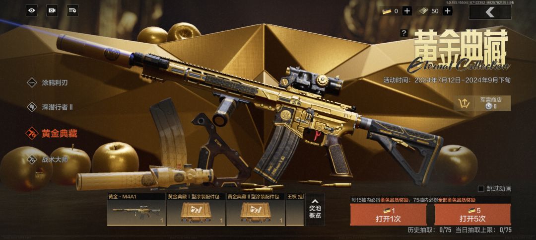“黄金典藏”枪械涂装军需的枪皮又是老员工M4A1了,我记得距离上个枪皮也才过去不久,这个黄金·M4A1的枪皮的总体配色还是给我一种富有奢侈感的感觉的,也是符合了黄金典藏的主题了,但是跟上一款M4A1枪皮比起来个人而言还是略逊一筹,并且是时间间隔不久,同款枪械皮肤时间感觉还是尽量别挨太近了。