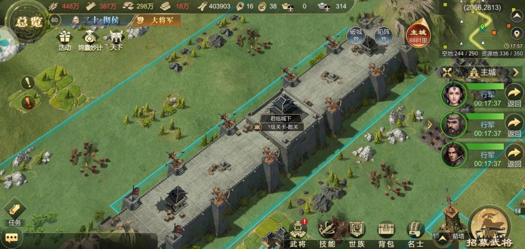 高级城打发非常单一,无非就是拦截援军加北门强攻为主。援军数量不多但是个个都是铁甲小宝,人少打不赢,人多打着真的来瞌睡。单纯削弱难度,不改变玩法,起不到根本作用。这里,我也有几点建议。 1.增加戍卫城支援效率,但是减少援军的属性,不要让援军都跟铁甲小宝一样,除了耐打就是耐打。 2.增加城池外围防御工事,按照郡城,国都,洛阳依次增多。防御工事可包括但不限于(箭塔,拦🐴路障,要塞,巡逻队) 3.进一步削弱城墙厚度,建筑厚度,城防部队数量增多依然减少生命值。 4.将对援军造成的伤害算入攻城排行。毕竟,做最多的事,拿最少的奖励不太合理。 如果按照以上几点进行修改,那么降低了前期攻城的难度,而增加了后期攻城的可玩性。不至于前期打不赢,后期有手就行,背离了游戏先易后难的初衷。以上观点仅为个人思考,欢迎喜爱这款游戏的玩家一起讨论,以及可以获得官方的认可。
