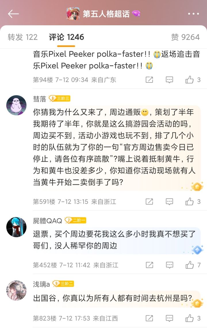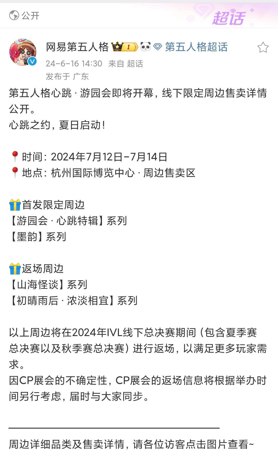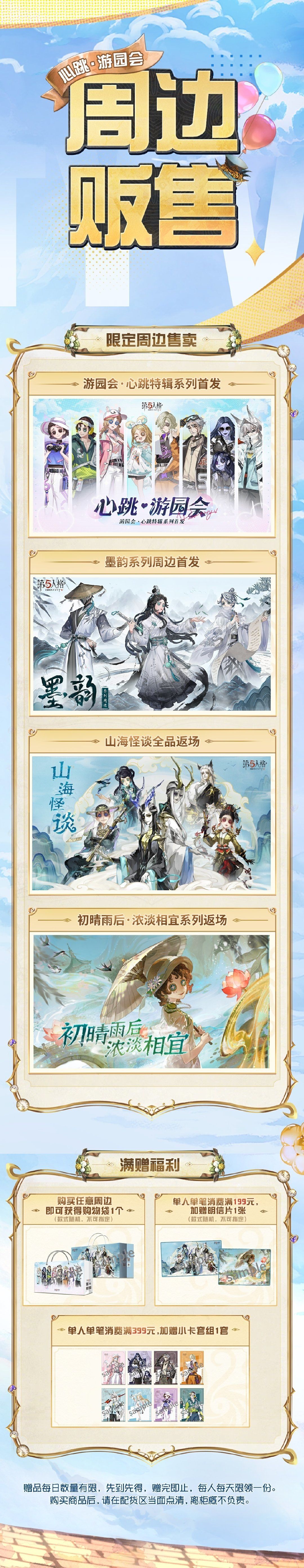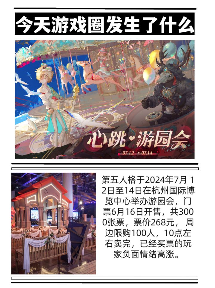 第五人格于2024年7月 12日至14日在杭州国际博览中心举办游园会,可购买限定周边。门票6月16日开售,共3000张票,票价268元。因官方并没有提前通知官方周边限购100人,在10点左右周边卖完,很早遍来到现场等待若干小时的其他玩家因此买不到周边,从而致使负面情绪高涨。
