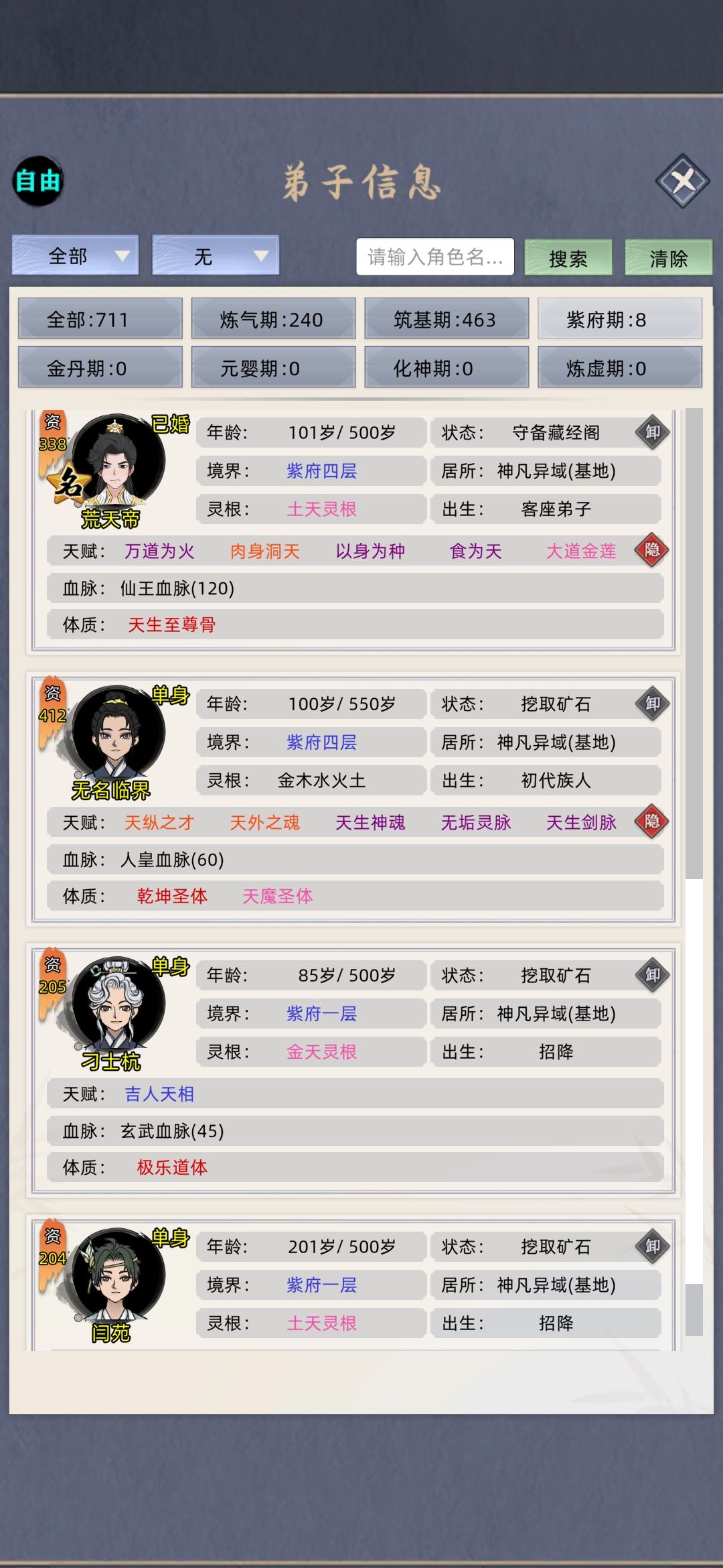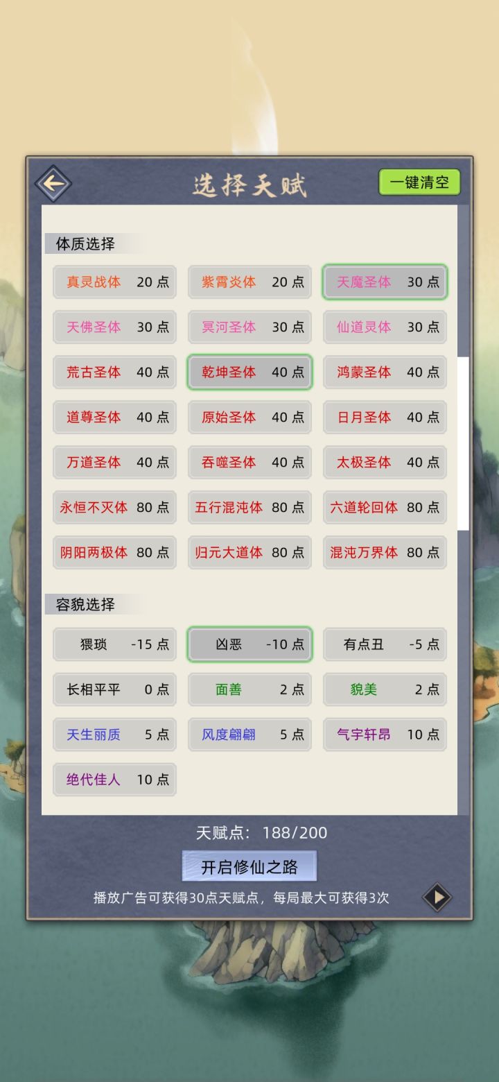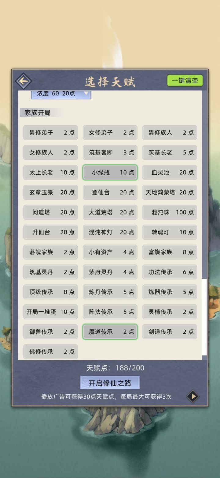 这个不管是家族、修仙、普通什么的,都可以用,别跟我你个玩家族模式的没成就。我这纯放养,没喂丹药、灵鱼、(换灵丹、天赋丹、聚灵阵、花环)有条件的加天赋台.大荒塔。要是满足了这些条件,五大名人,除了荒可能打不了,其他拿捏,现在跟荒差十五万实力。(开局像上面那样选择,天赋别问问就是卡天赋格、包满突破率结婴前一遍过,体质乾坤、天魔自己看属性、魔道功法推荐阴阳要术,人皇血脉悟性一般都到300)嗯,我不说多废话了……