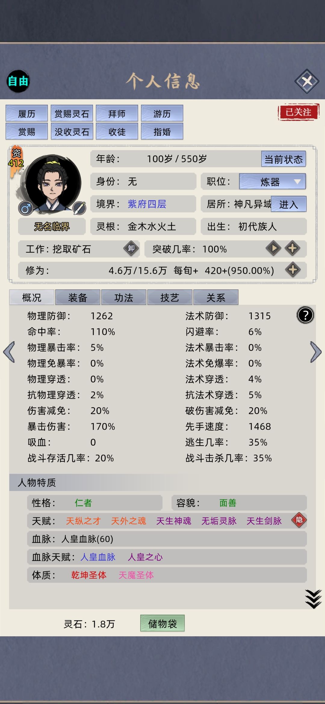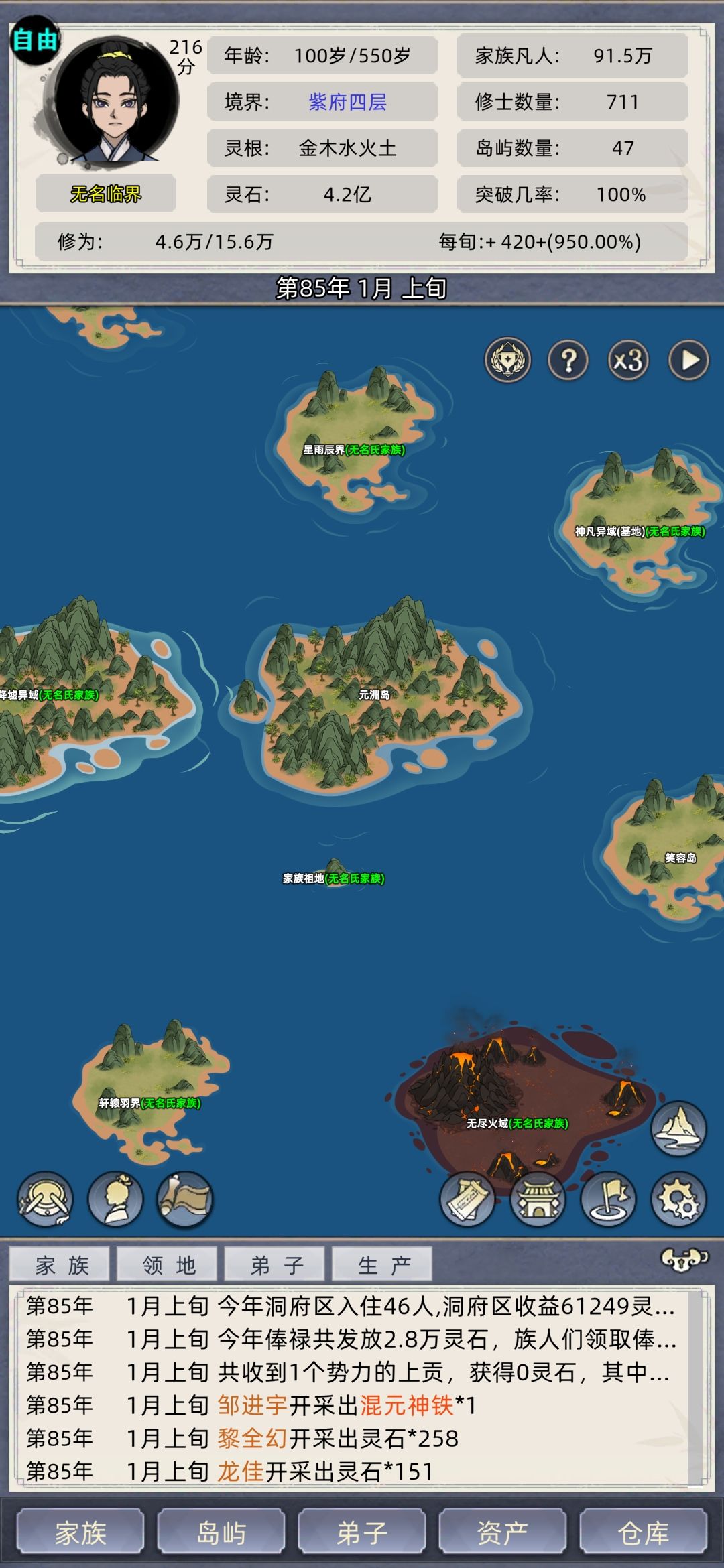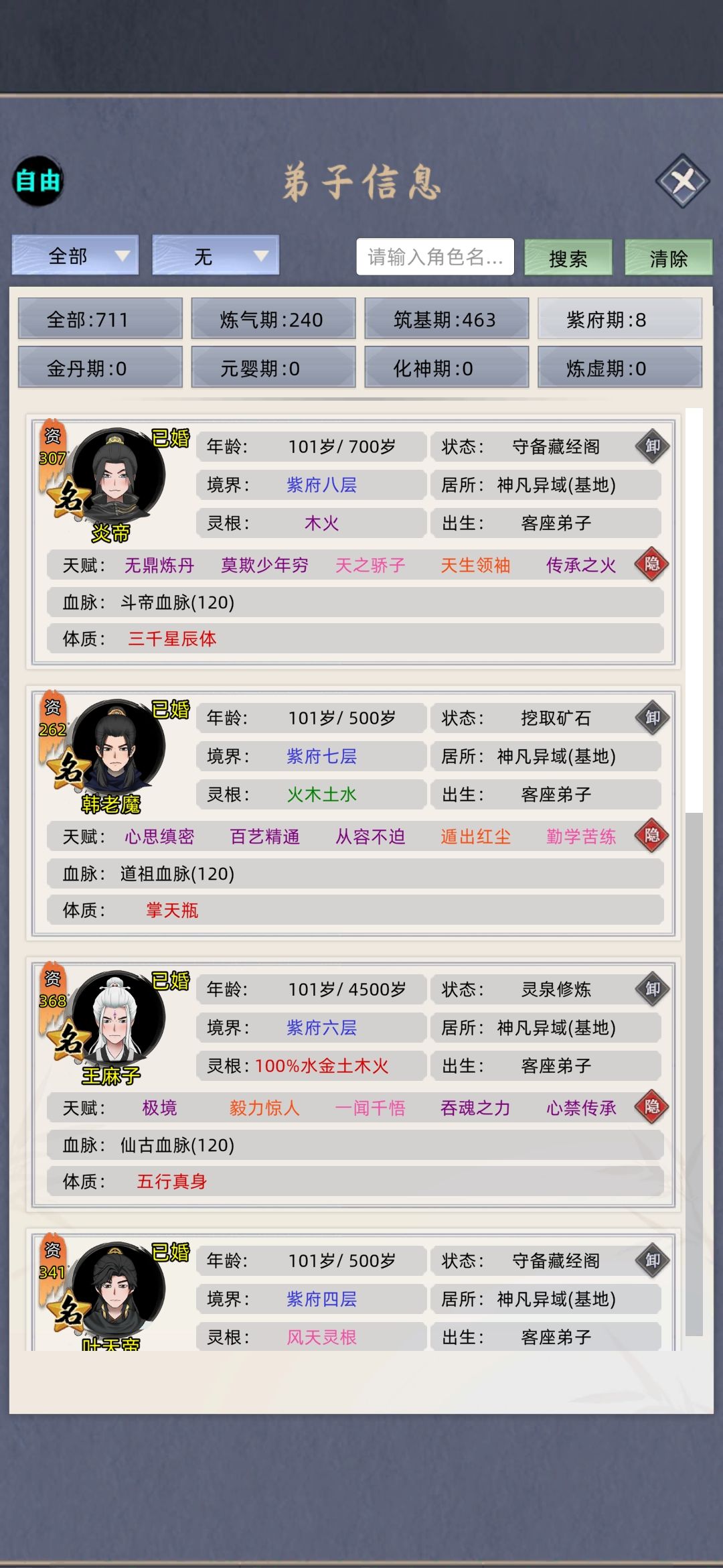 这个不管是家族、修仙、普通什么的,都可以用,别跟我你个玩家族模式的没成就。我这纯放养,没喂丹药、灵鱼、(换灵丹、天赋丹、聚灵阵、花环)有条件的加天赋台.大荒塔。要是满足了这些条件,五大名人,除了荒可能打不了,其他拿捏,现在跟荒差十五万实力。(开局像上面那样选择,天赋别问问就是卡天赋格、包满突破率结婴前一遍过,体质乾坤、天魔自己看属性、魔道功法推荐阴阳要术,人皇血脉悟性一般都到300)嗯,我不说多废话了……