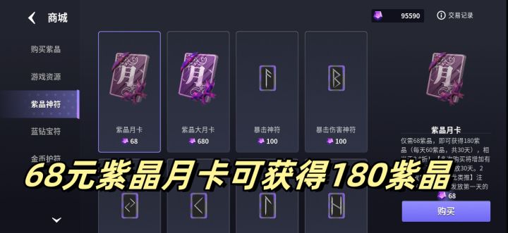 增加68元紫晶月卡!可获得180紫晶!相当于3.8折!