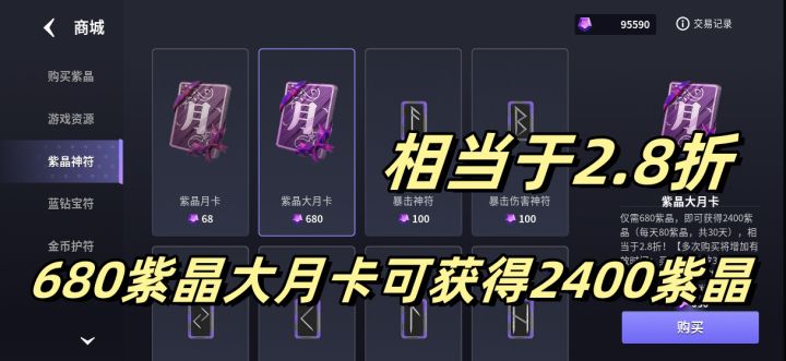 增加680元紫晶月卡!可获得2400紫晶!相当于2.8折!