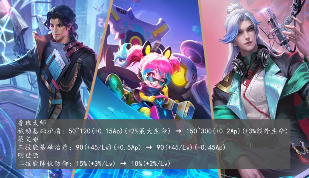 鲁班大师、蔡文姬、明世隐的调整不用过于介绍,很简单明了的调整,鲁班大师全面增加被动基础护盾值,坦度提升,蔡文姬降低大招0.05AP治疗加成,回复能力下降,明世隐减少2技能10%降低防御效果,队友对明世隐攻击的目标,打出来的伤害会下降。