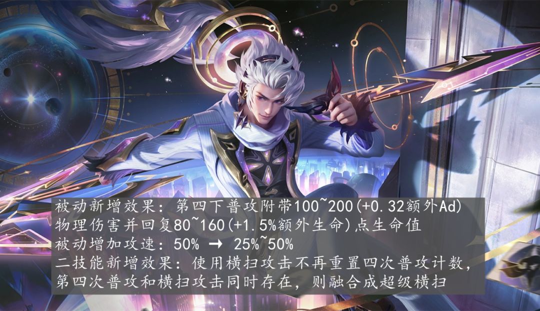 韩信终于喜提加强,被动新增第四下攻击附带额外伤害和生命回复,伤害和输出会有所提升,另外2技能的横扫不会重置普攻计算,当有第4下普攻的时候使用横扫,那就会变成超级横扫,虽然没有公布超级横扫的属性,但有可能是伤害更高,攻击范围更广的强化攻击。