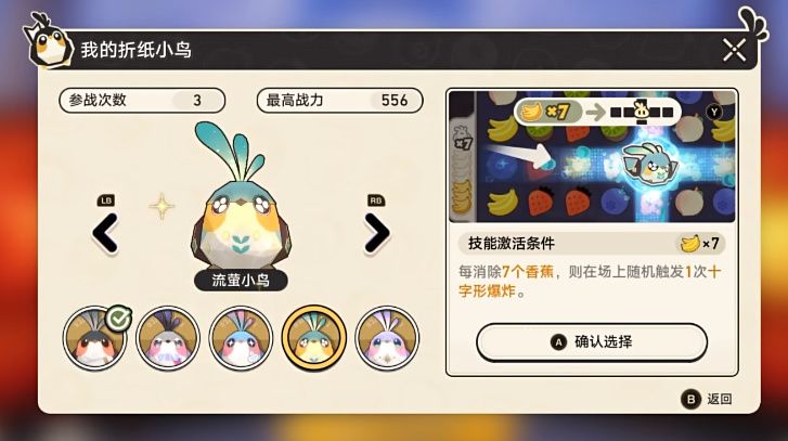 不久前,《崩坏:星穹铁道》更新了一个全新的趣味玩法“折纸小鸟对对碰”。该玩法是一个以三消为主要玩法的吃鸡小游戏。开局玩家可以从五只技能各异的小鸟中,选择一只作为自己的角色,以开始本局游戏。在该玩法中,每局都会有五名其他玩家参赛,玩家需要在规定步数内,尽可能地获取更多的分数来确保自己能够顺利晋级。每回合结束时,系统会计算对战双方本回合获取分数的差值,如果差值为正,则对方扣除等于差值加上玩家自身基础攻击力的生命值,反之则自己扣除对应生命值。玩家首次生命值归零后,并不会直接出局,此时玩家还可以继续下局对战,直到回合结算时的分数差值再次为负,才会出局。同时活动期间,游玩该玩法还有概率获得特定四星角色,这么好的机会可千万别错过了!