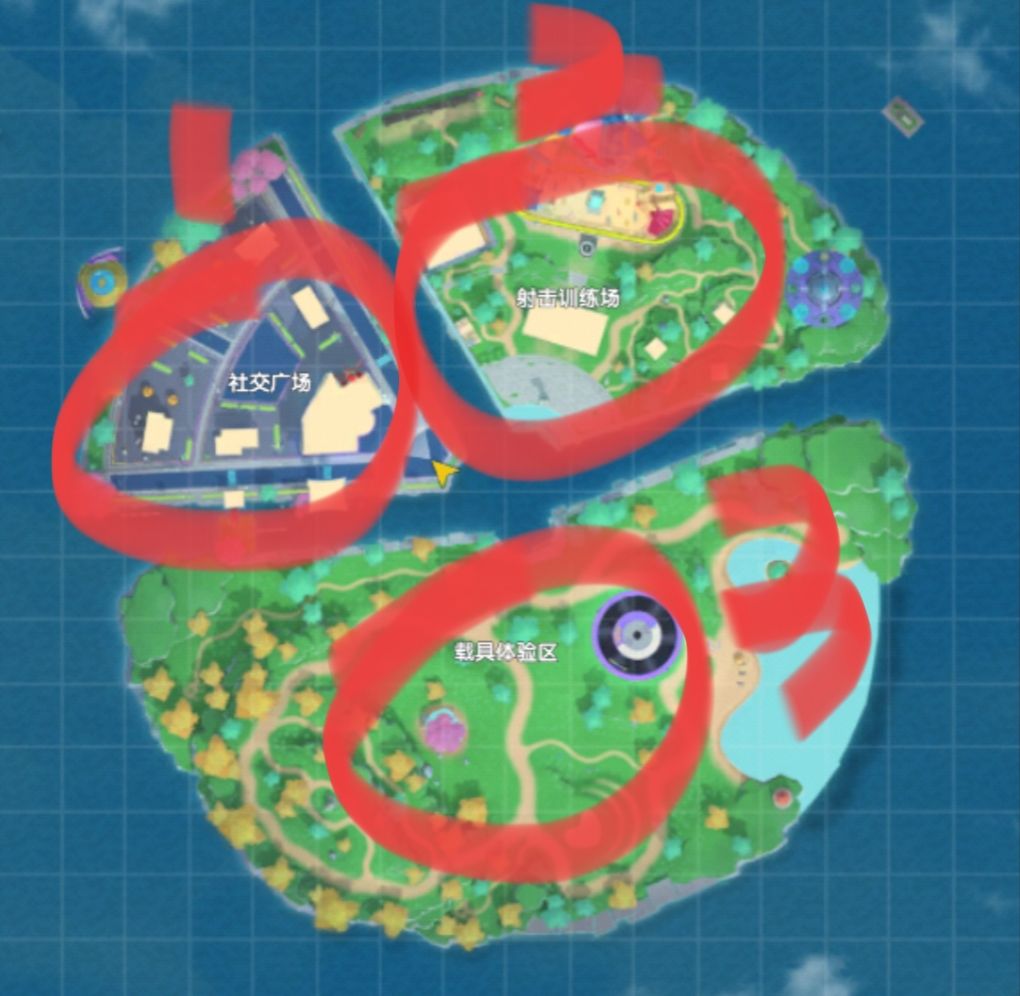 披萨岛分为三个区域,分别为:社交广场、射击训练场、载具体验区。