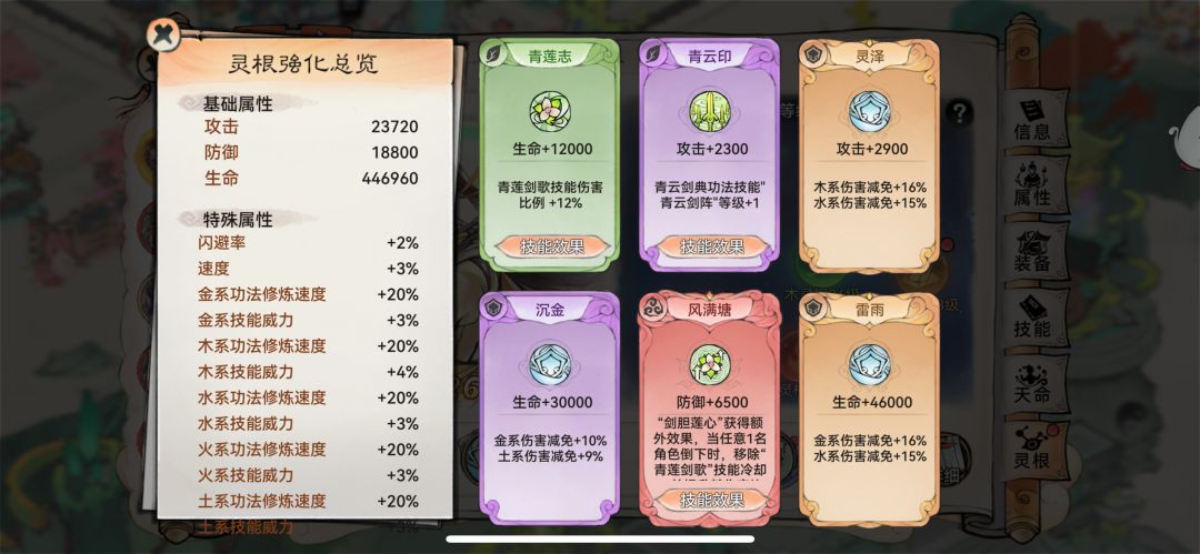 天命方面的话,【蕴雷】增强了韩立的普攻,让韩立的普攻变成了可以攻击敌方四个人的aoe伤害,并且还可以祛除两个增益效果。【剑盾】是一个攻守兼备的技能,护盾存在期间,受到敌方伤害就会反击对手,还会连带辟邪神雷祛除三个敌方弟子的增益效果;如果剑盾被破就会立刻行动释放自己的本体技能青元剑芒,而且当韩立自己复活或者友方弟子阵亡都会刷新剑盾。