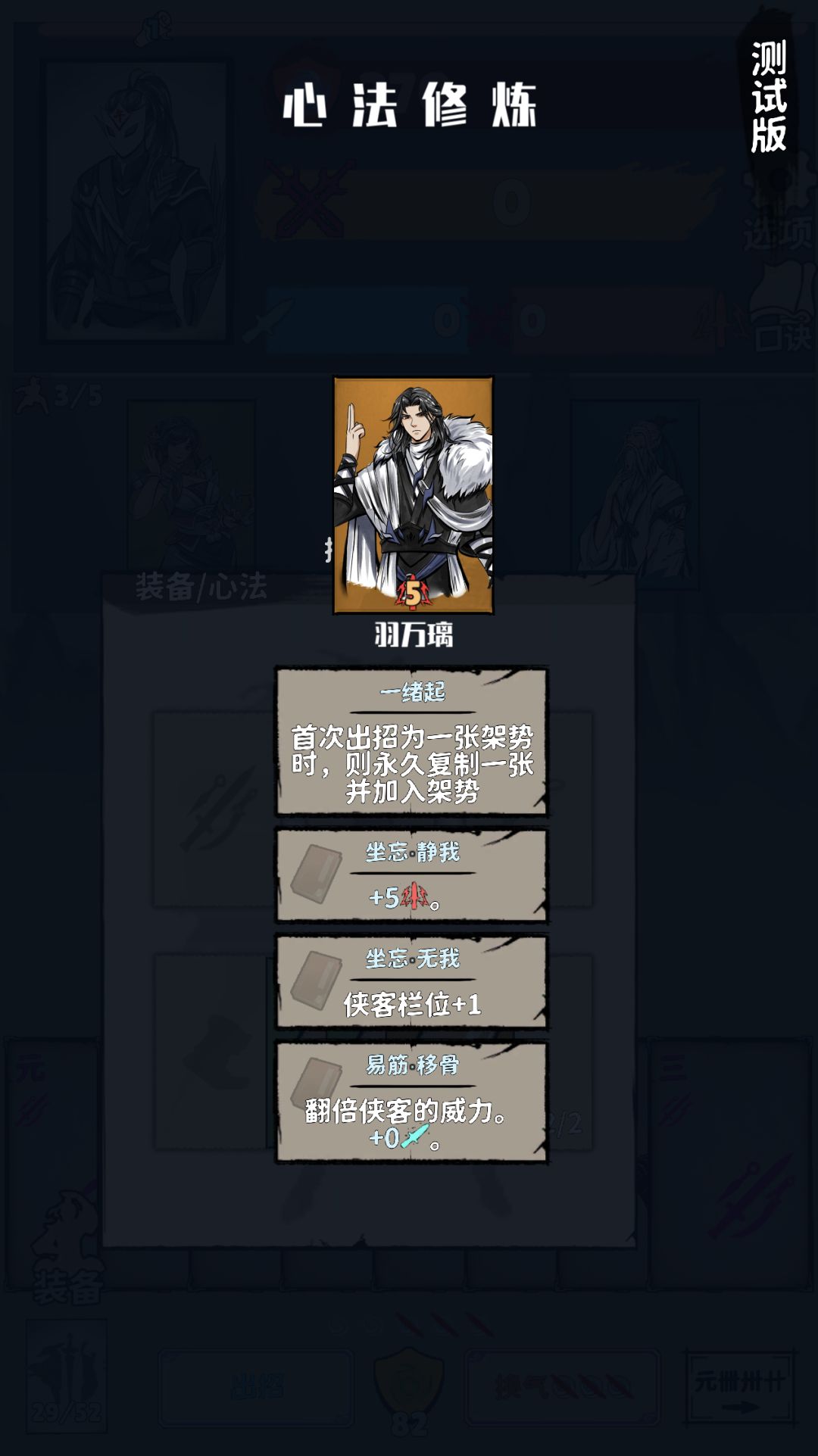心法系统:主角可以装备心法,心法也可以给侠客学习。等于小丑可以学习技能被动了,这让游戏的变数大大的提高。