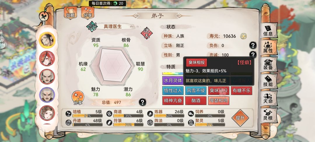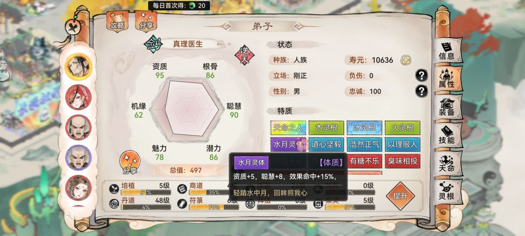 这是金木现在已知可以提升效果命中的途径 其中千杯不倒可以通过喝龙虎山的茅台获得而虚张势要靠随机弟子怪癖 水月灵体就是靠后山体质泡出来