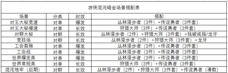 新水游属于伤害分布比较分散的BD,所以最优搭配为三件狩猎大师+三件传说勇者,其次是三件丛林漫步者+三件传说勇者,