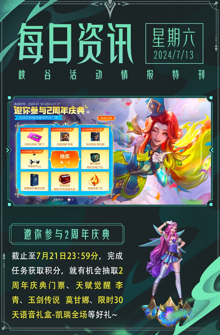 奖励:2周年庆典门票,天赋觉醒 李青,玉剑传说 莫甘娜,限时30天语音礼盒-凯瑞全场,限时皮肤随机宝箱(7天),限量版珍藏设定集,平衡车Plus,龙魂水晶