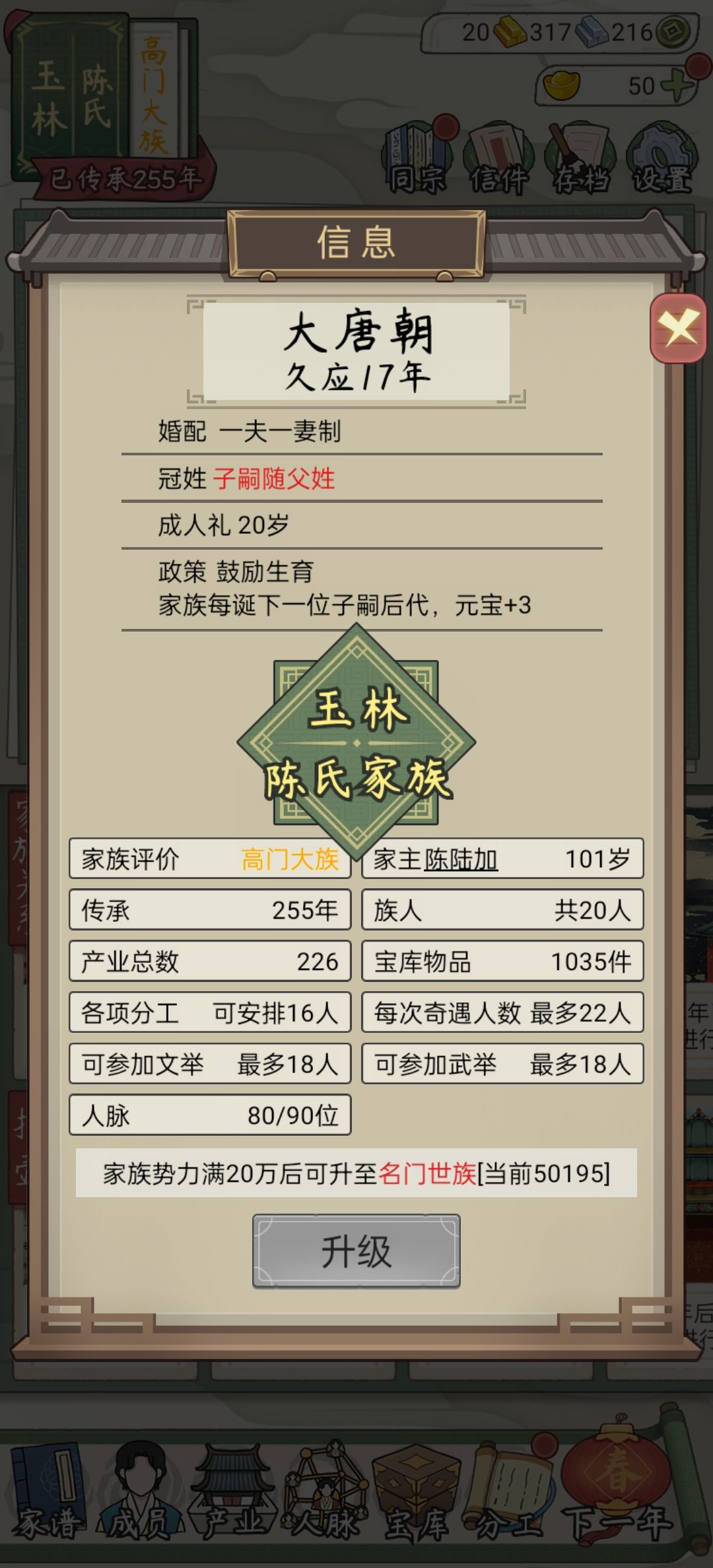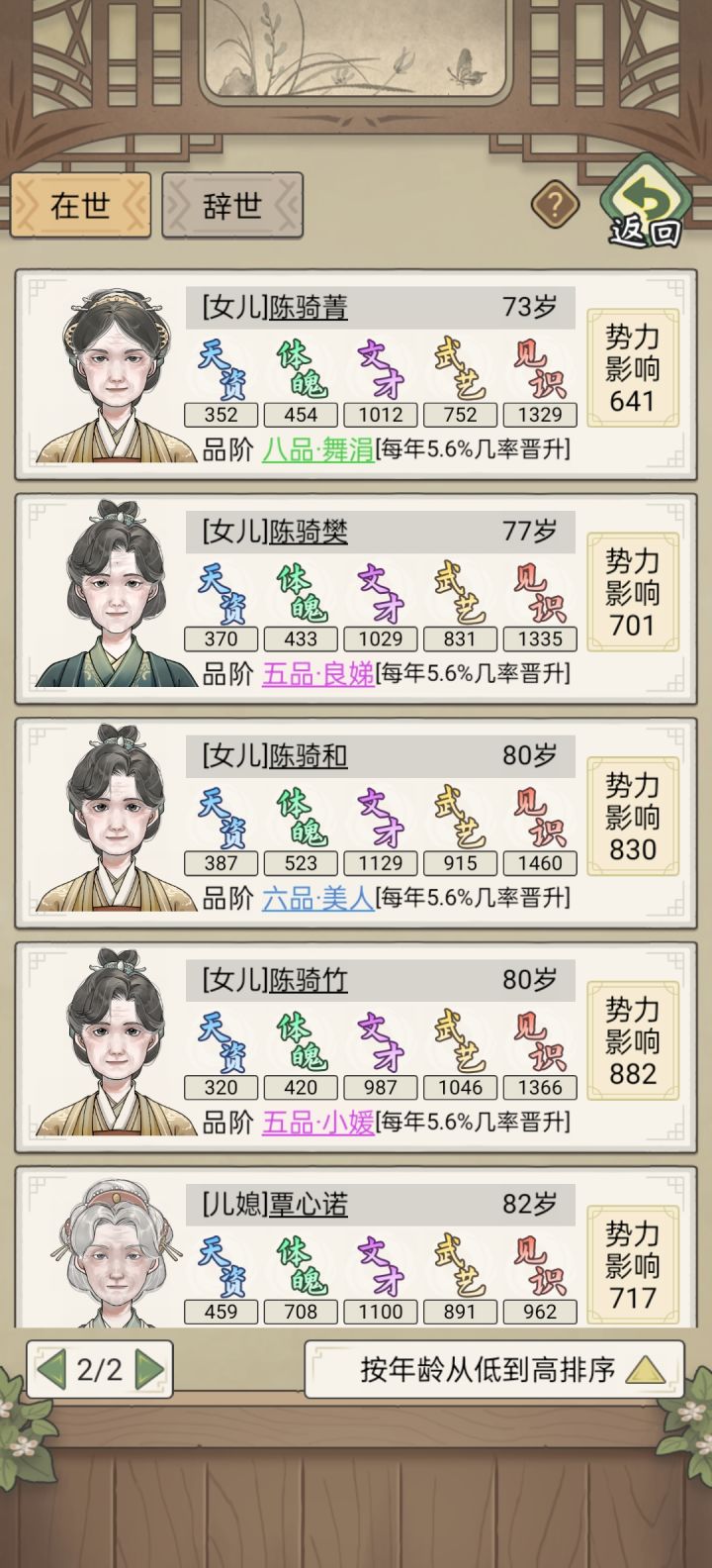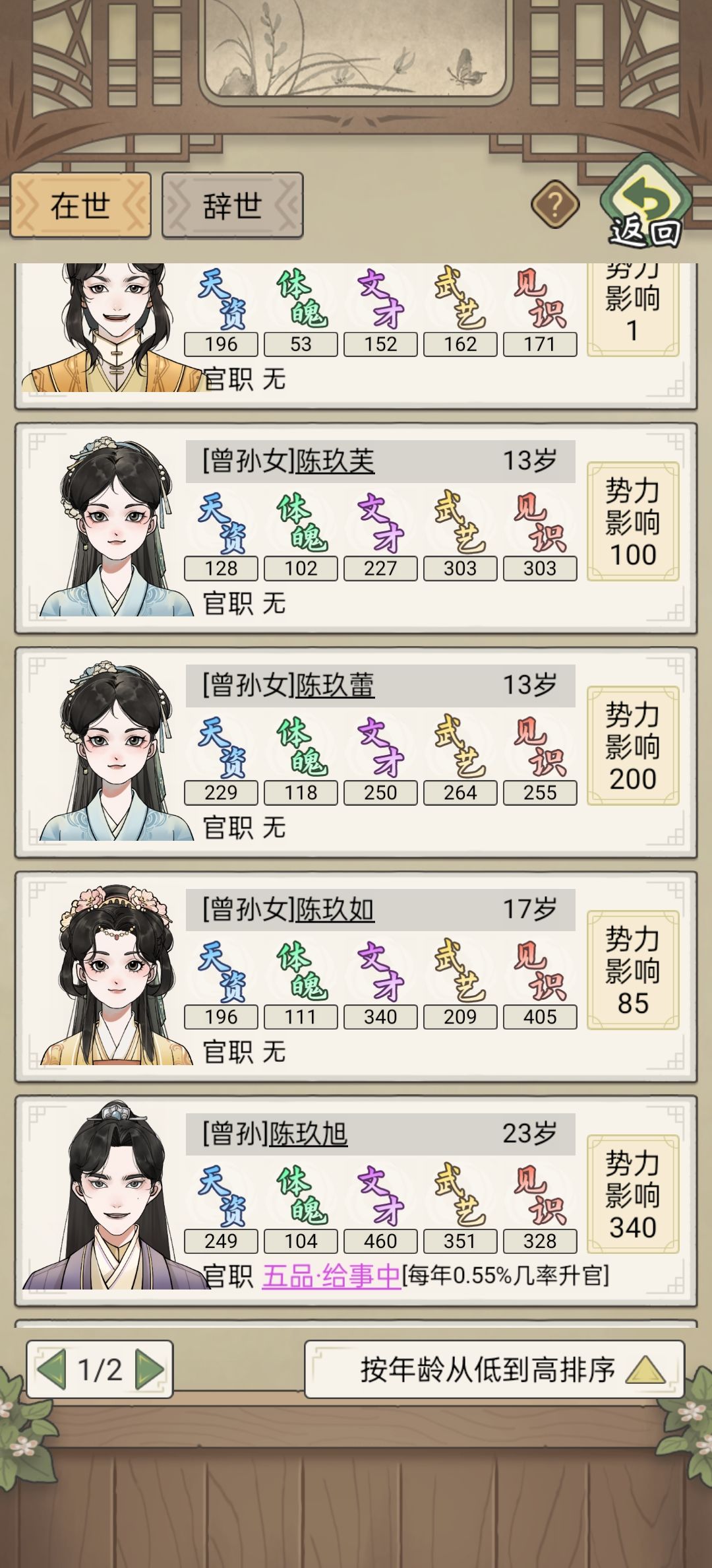④人脉可以选一些加见识的人,如皇商,赊刀人等。值得注意的是,家族人越少,每个族人每年分到的人脉就多,数值增加的就快,比如我现在这一代小孩,就享受到了人少红利。