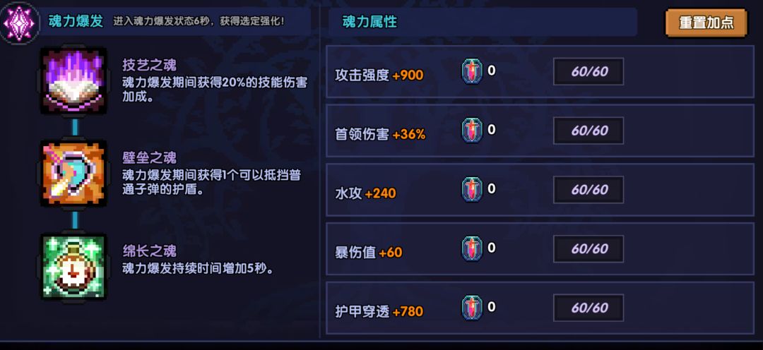 对于魂点不够用的同学,在满足穿透和暴击的前提下,各项属性平均分配点取,或者可根据自己面板来自己调整加点