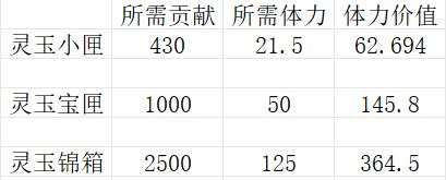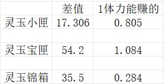 最后我们算出来,每种灵玉盒子的体力花费和体力的灵玉价值: