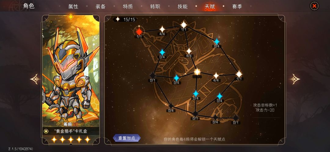 天赋点到那个减30攻目标+1那个,另外一个建议点+敏捷耐力的,因为这赛季不缺射程,看个人喜好选择。(天赋目标+1会减30攻击,大概对单会减15%的输出,但是道中清杂更舒服,个人建议,非必须点法)