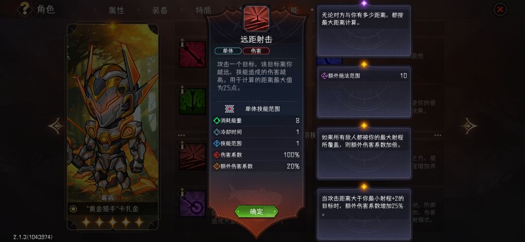 远距射击3个金词全拿,最核心紫词条距离按最大攻击距离算,必拿。少一个伤害都会降很多,可能会导致回合数翻倍增长。