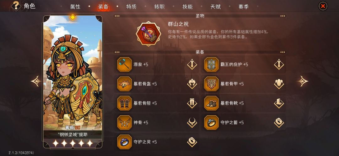 套装拿铁卫套,吃套装碰撞加成,十分的契合。词条一样除了受到治疗都能拿,尽可能肉一些就好。万能群山圣物加四维。