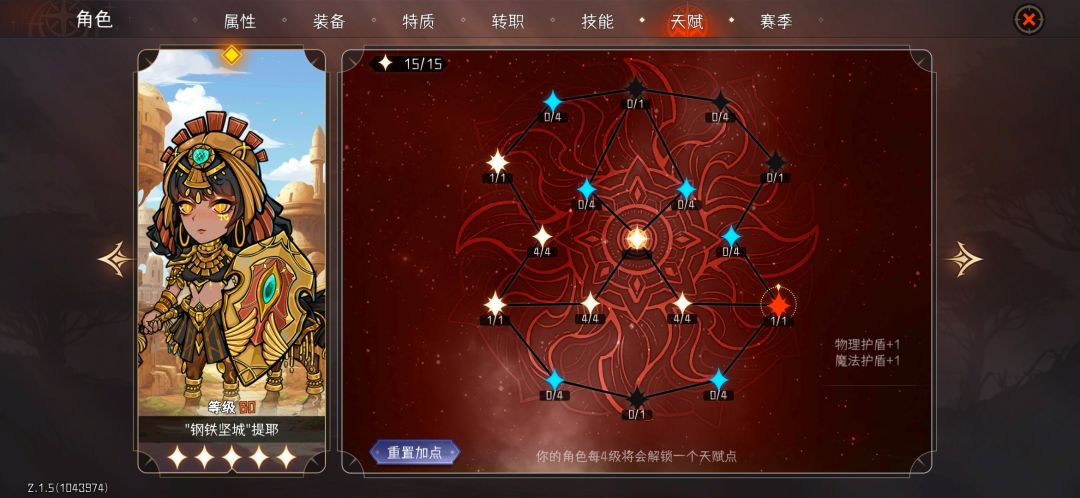 天赋把下半点满,及移动力+1,远程抗性+20%;冷却时间减1;物理魔法护盾+1。