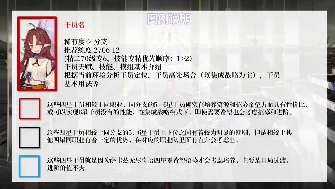 评价的维度主要有角色定位、干员用法,以及在活动推图和集成战略的表现等方面。