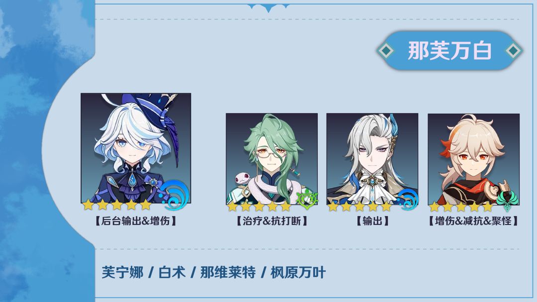 • 详细讲解由于芙宁娜的q依赖全队血量变化来叠层,能够做到高频、高额血量变化的那维莱特自然是她的最佳队友。组队逻辑也是相当简单,即那、芙作为队伍的主副c,配合一个减抗位的风辅,最后携带一名群奶来保证全队的血线。风辅位的首选自然是万叶,其次则是砂糖和温迪。奶位中e启动的白术则是当前的最优解,而能提供少量冻结增强稳定性的夏洛蒂则是最优的下位替代。由于需要保证那维莱特的倍率天赋满层,这里水系、风系的群奶相对不太适合入队。另外,在芙宁娜解锁二命后,队伍只依靠那维莱特的血线变化也能很快地叠满大招层数,这时候替换奶位携带一个磐岩钟离能进一步提高队伍的上限,但整体思路并没有什么变化。队伍的手法也是比较简单,芙宁娜e闪q起手,接上那维莱特eq产水珠,风系角色扩散减抗,奶位释放群奶技能并叠满龙王天赋,最后那维莱特三次重击输出,打完进入下一轮循环。