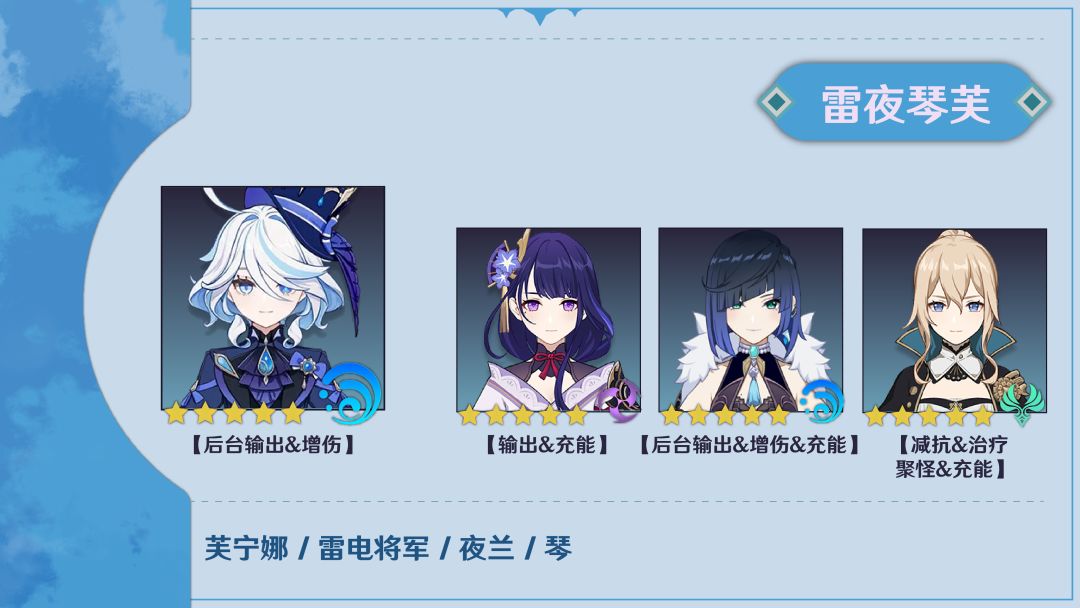 这支队伍在芙宁娜刚刚上线时可以说是非常热门,在对单打桩环境中不失为一个不错的选择。但对群时琴的击退体验不怎么好,同时由于夜兰和芙宁娜还是更偏向对单一些,靠一个缺少关键拐的雷神对群有时会有点刮痧,且其中雷神作为前台不怎么缺少增伤区,队里的两个增伤位会显得有些大材小用,因此可以考虑将雷神的圣遗物朝攻击方向调整。
