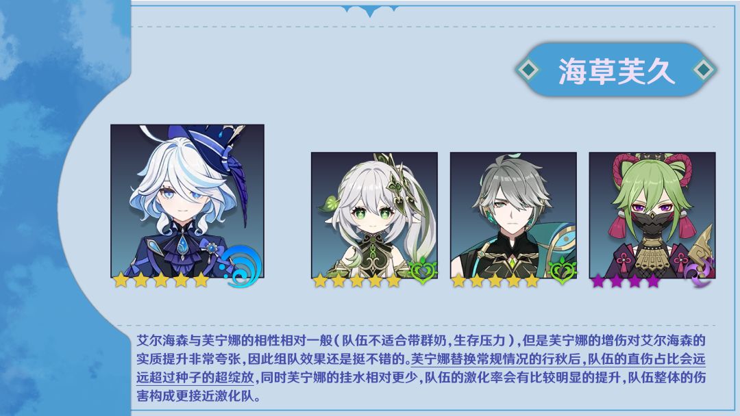 艾尔海森与芙宁娜的相性就相对一般了(队伍不适合带群奶,生存压力),但是芙宁娜的增伤对艾尔海森的实质提升非常夸张,因此组队效果还是挺不错的。芙宁娜替换常规情况的行秋后,队伍的直伤占比会远远超过种子的超绽放,同时芙宁娜的挂水相对更少,队伍的激化率会有比较明显的提升,队伍整体的伤害构成更接近激化队。
