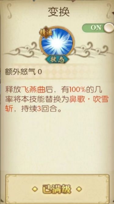 核心技能:奥义飞燕曲这里就要提到前面惬意的作用了,在释放奥义技能后消耗所有的惬意,获得高额的攻击速度加成,在第二回合满惬意的情况下增速还是很客观的,同时释放后替换为奥义技能鼻歌·吹雪斩。