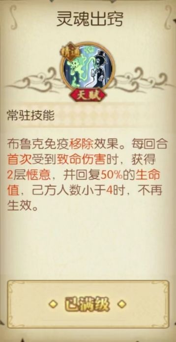 核心天赋:灵魂出窍免疫移除效果在面对UR花魁阿玲时是一个非常不错的生存机制,在己方存活人数足够且受到致命伤害时回血并获得惬意,当然布鲁克在必闪情况下能被打出回血的情况还是很少。