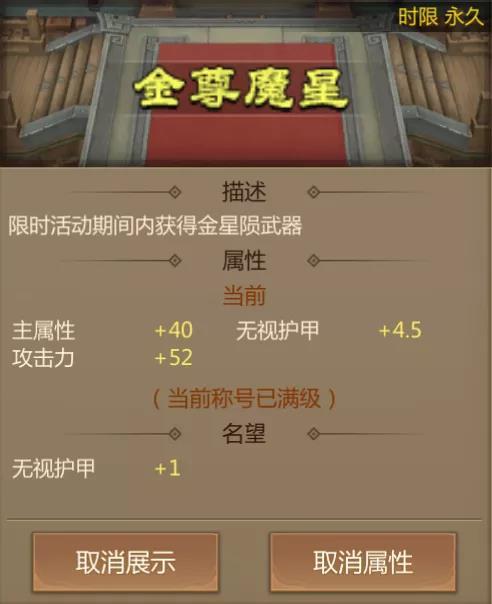 金尊魔星能够为大家带来【主属性+40、无视护甲+4.5、攻击力+52】的强力属性,如果梦梦没有记错的话,金尊魔星可以称得上是当前版本最强称号了!