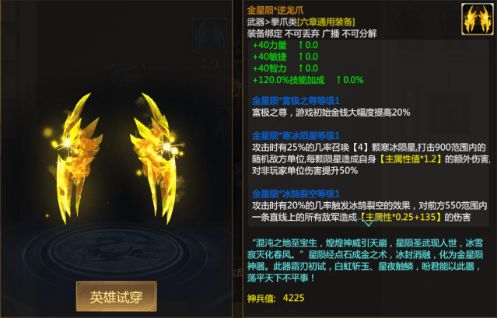 技能三 金星陨*冰鹄裂空攻击时有20%的几率触发盘龙冰戟的效果,对前方550范围内一条直线上的所有敌军造成【主属性*0.25+135】的伤害。