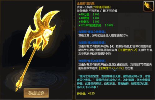攻击时有25%的几率召唤【4】颗寒冰陨星,打击900范围内的随机地方单位,每颗陨星造成自身【主属性值*1.2】的额外伤害,对非玩家单位伤害提升50%。