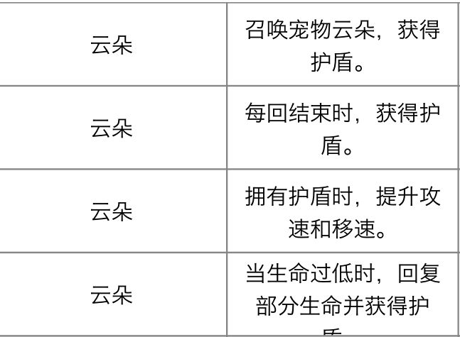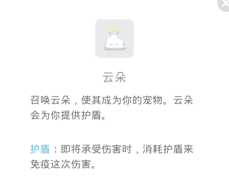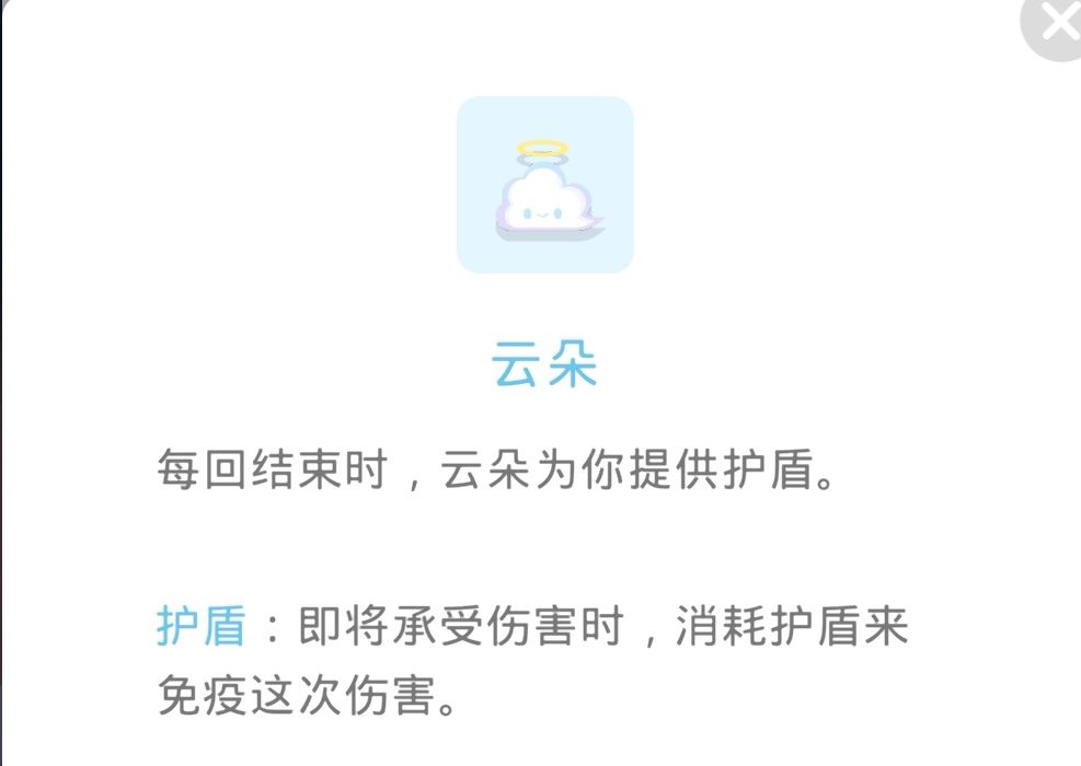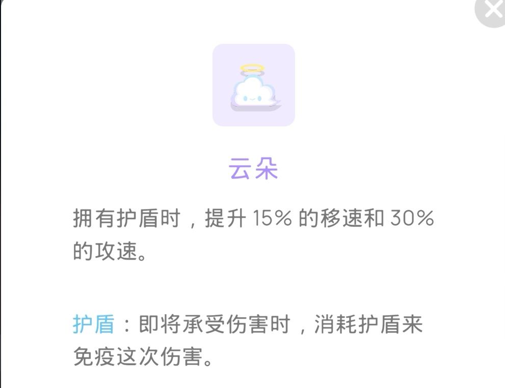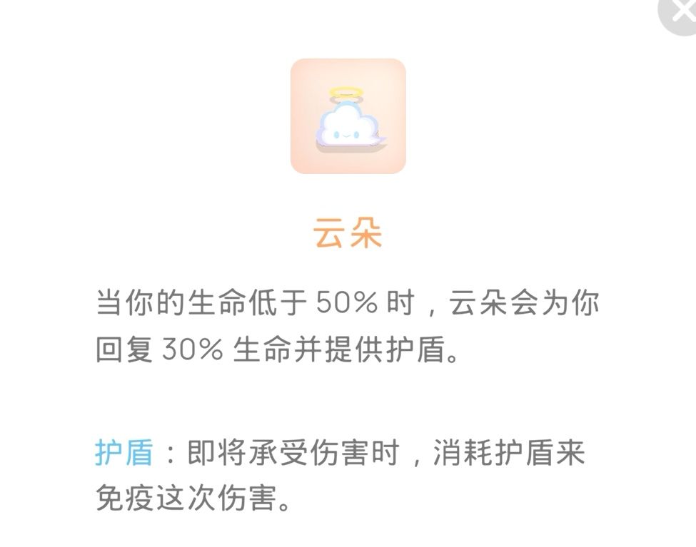 云朵:无伤玩家建议用,普通玩家也可以给自己买个保险,4级云朵加血量非常高,几乎相当于满血复活,护盾也可以挡住伤害,唯一缺点就是对非无伤玩家不友好