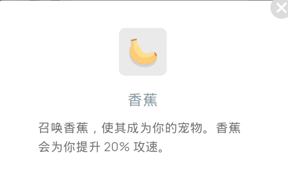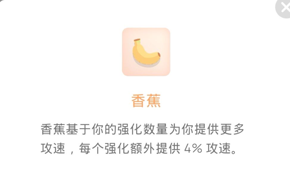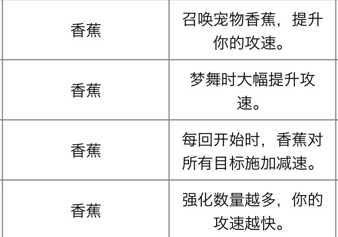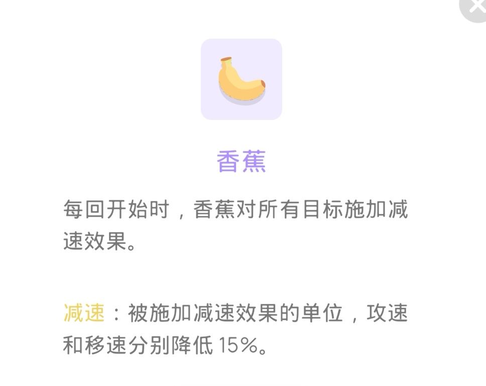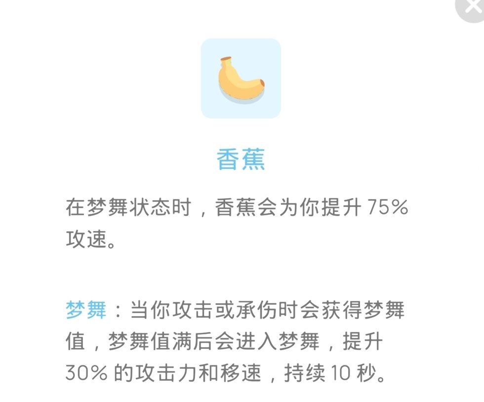 香蕉:带了熔岩剑必选这个,高伤害+高攻速=无敌,如果攻速不到1.5都建议选个1,2级香蕉,熔岩剑玩家尽量拉到4级