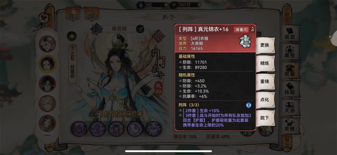综上所述,我会更推荐带列阵套。好处在于开场就可以联动南宫婉的吸血。【南宫婉的吸血机制是有盾或者无敌时被攻击才触发。具体可以去实战视频看,开场吃一轮爆发后吸50%血,收益是相当大的,特别是越战的时候】另外,保队友的能力会非常强。放一张开场列阵给队友套盾的图。【天道树有护盾强度,隐士古宝有护盾强度,本命法宝天幕对护盾有加成。最终造就了这样白花花的一张套盾图。】