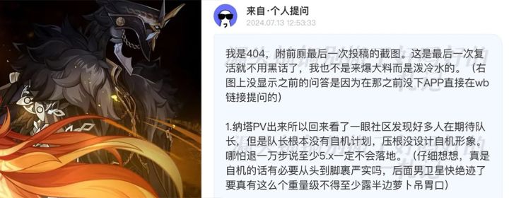 404舅就爆料纳塔pv中出现过的队长,队长根本没有自机计划,压根没设计自机形象,至少在5.0纳塔版本不会进卡池