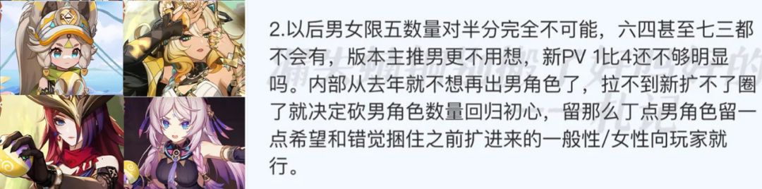 以后男女限五数量对半分完全不可能,米哈游决定开始回归初心,减少男角色数量,但也会留一些男角色。