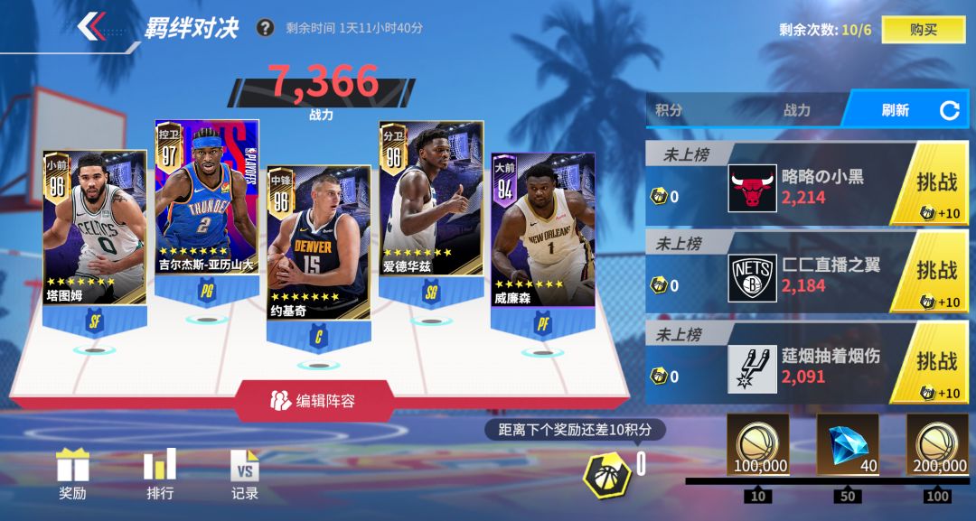 1. 挑战次数:每天将获得一定数量的免费挑战次数,利用这些次数可以和对手进行比赛。您还可以购买额外的挑战次数,增加获胜的机会。
