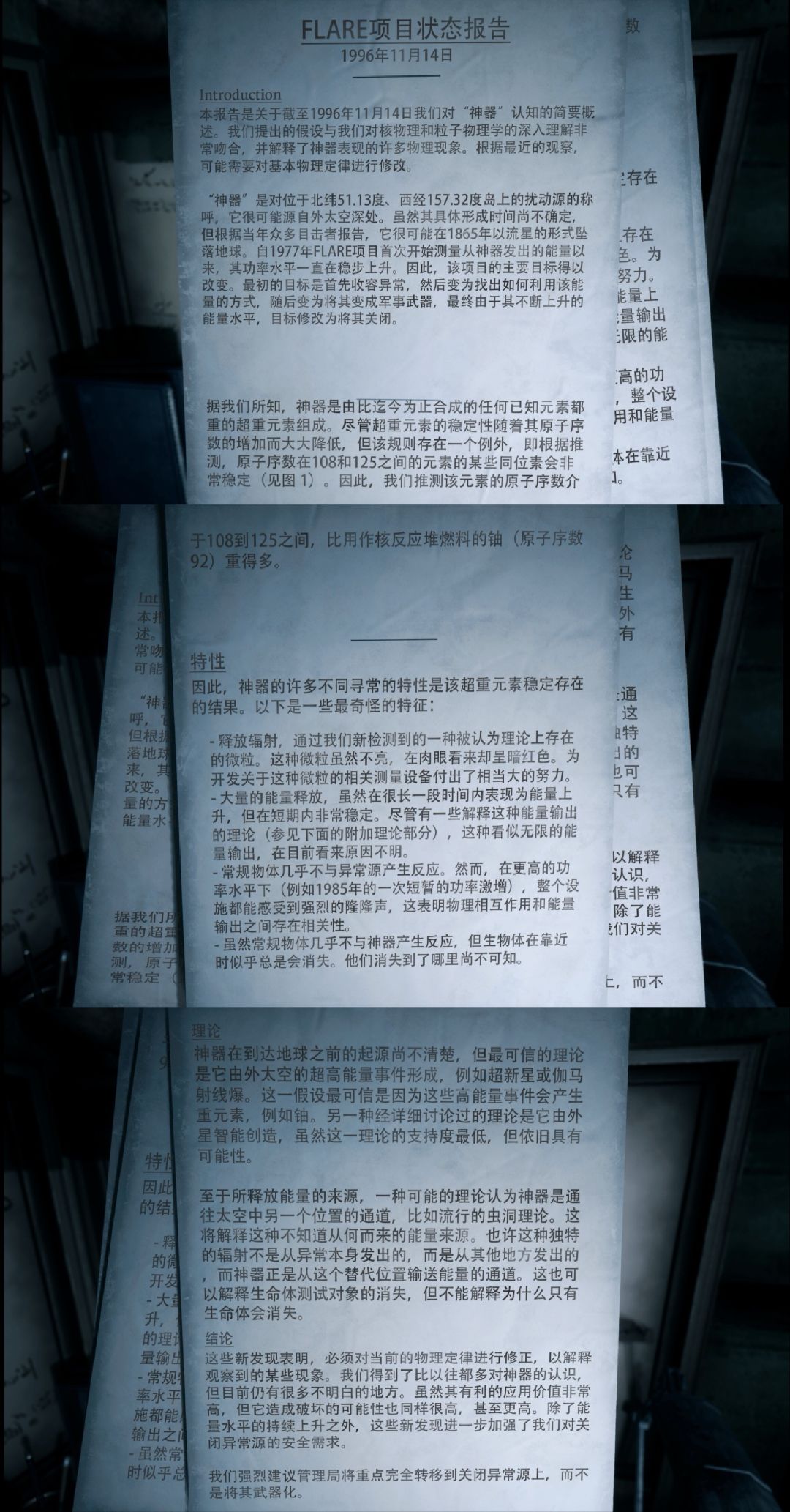 这一章是这个系列的完结篇。随着一层层深入探索LAMBDA设施,找到FLARE项目的真相——对来自外太空的“神器”的研究,最初集中于“神器”的收容,之后转向利用其特性,再到后来试图使其武器化,但最终,在尚未把握“神器”特性的情况下,贸然行事,使得无数人凭空消失,没有尸体,没有踪迹,只留下尚在运转的机器。主角在深入了解到研究所的真相后,最终炸毁“神器”。故事到这里就结束了,但“神器”最终会因为人类世界的炸药而消失吗,“神器碎片”会流向何方,它的威力地球能否承受,还会有后来者再来追寻真相吗?一切都无从得知。(还有这个第一视角的气象学家,感觉不是普通人类啊,不用吃不用喝不用休息,毒气不会影响到他,黑影人还能帮他,也太厉害了吧。)