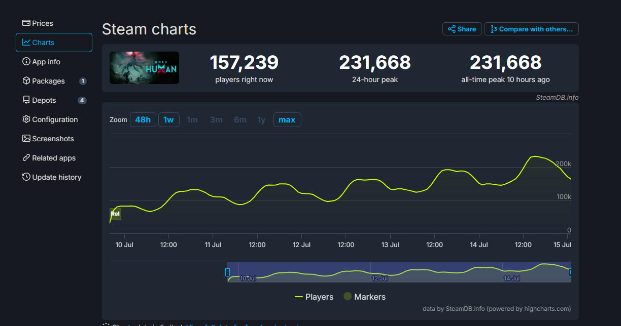 开放世界免费多人射击游戏《七日世界》,Steam同时在线峰值在周末达到新高,来到23万1668人,是首发时在线数据(10.3万)的两倍还多。
