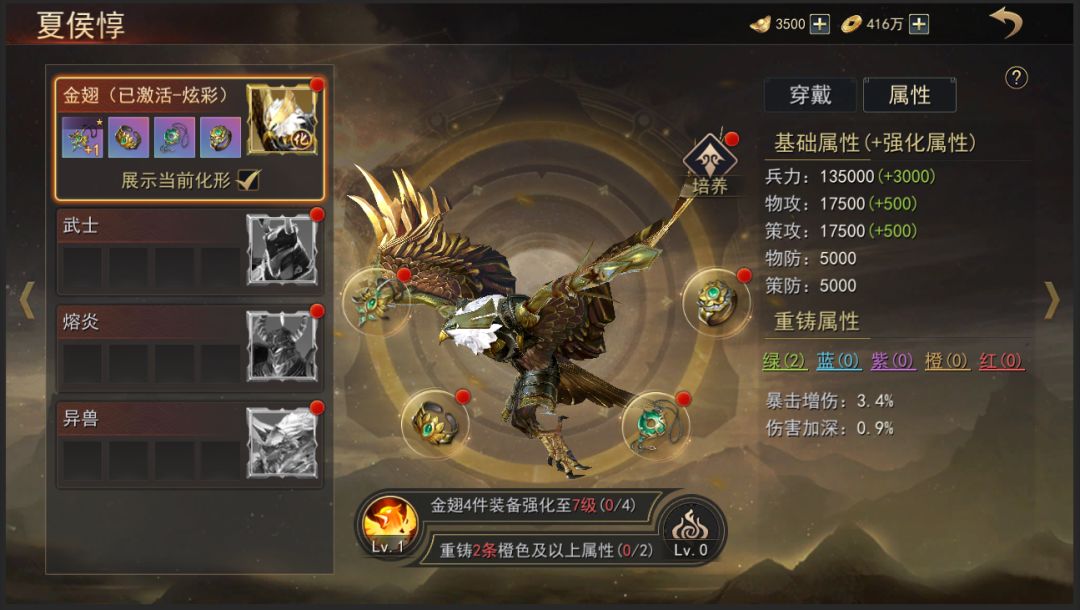 3、灵装有橙色、红色、炫彩3种品质,品质越高属性越高。