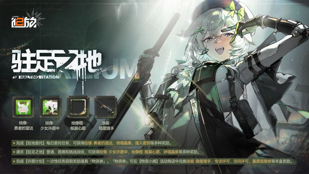 - 【驻足之地】困难战役将与普通战役同时开放,指挥官可通过消耗每日提供的「驻地券」来进行困难模式挑战。「驻地券」还可用于困难模式自律作战,自律将获得奖励道具「物资券」。